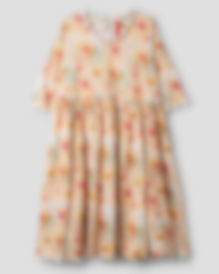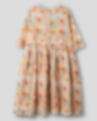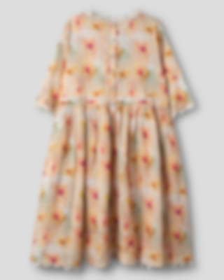 Short-sleeved, knee-length dress in flower voile. Endings with lace, buttoning at the back, wrinkled from the waist for lovely volume and side seam pockets.
