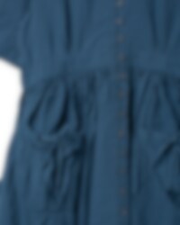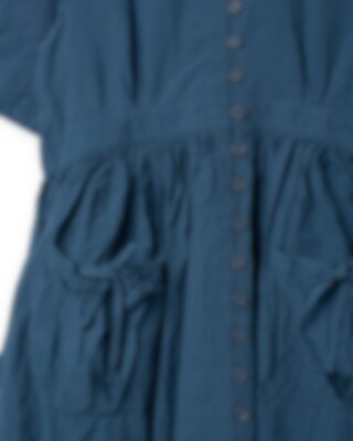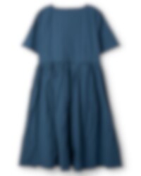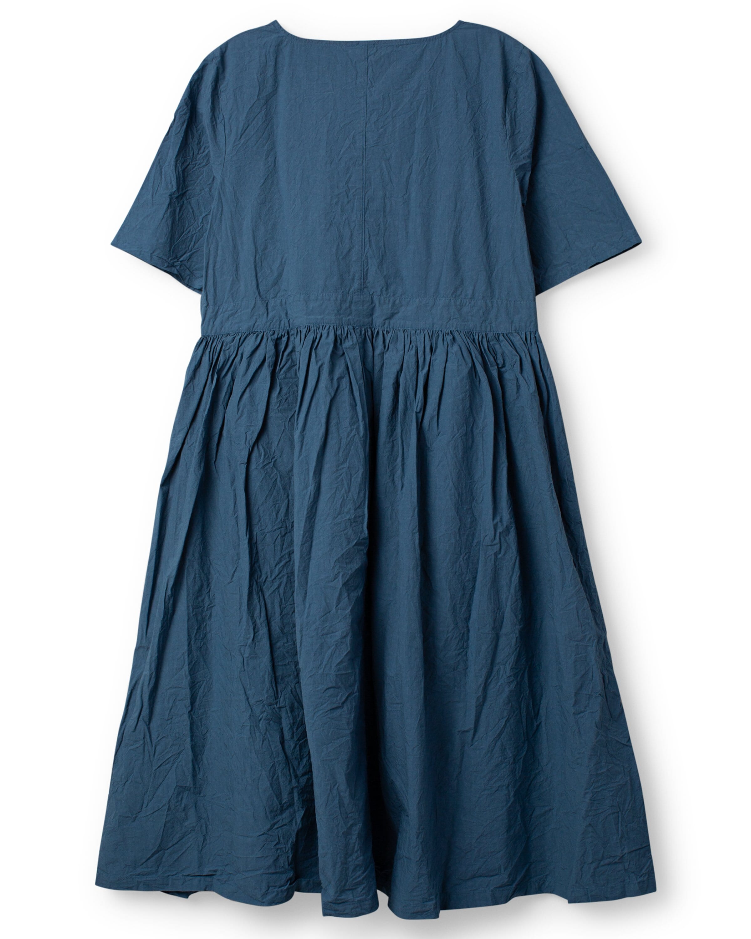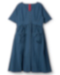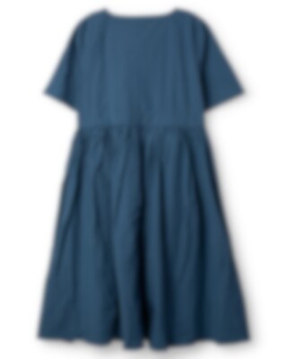 V-neck, calf-length dress in cotton with short sleeves. Buttoning with buttons and loops and external pockets with drawstring front, wrinkled skirt for a lovely volume.