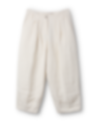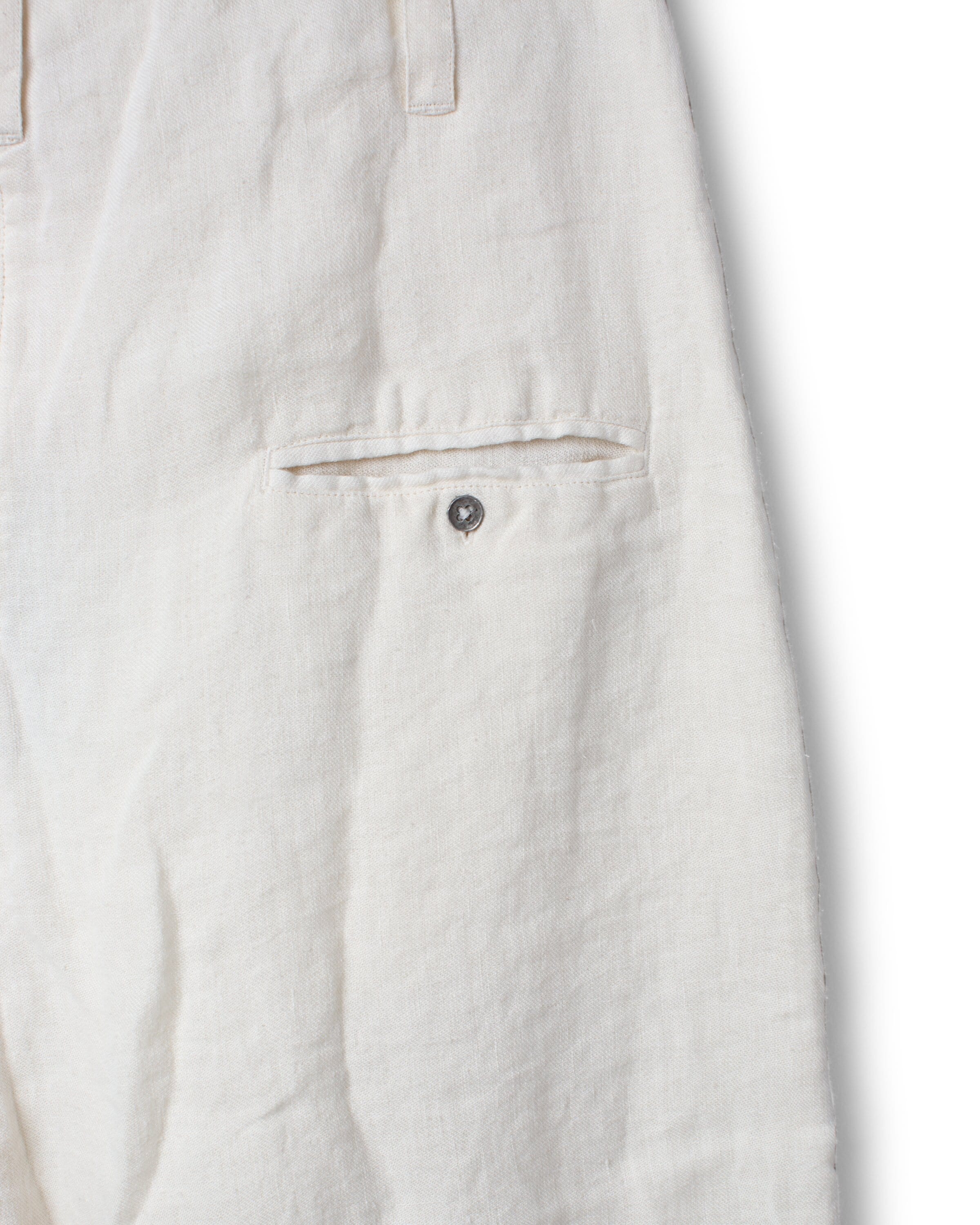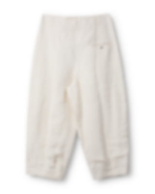 Wide, double layered trouser with the top layer in twill and cotton underneath. Button fly, pleats and pockets front, belt loops at the waist and a jetted pocket at the back.