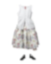 Ankle-length flounce skirt in flower cotton with wrinkled frills and front buttoning on the bottom flounce. Smock at the waist for a good fit, belt loops and wrinkled from the smock for a lovely volume.