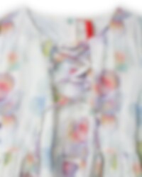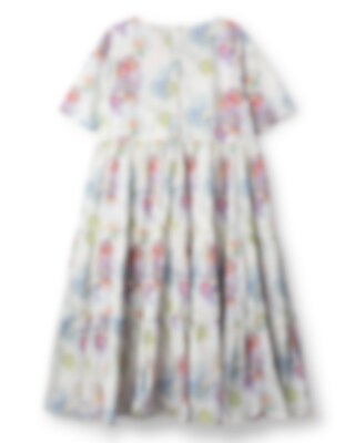 Calf-length, short-sleeved dress in flower cotton with lacing and wedge mid front and back buttoning. Wrinkled skirt and additional flounces for a lovely volume and side seam pockets.