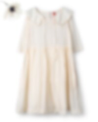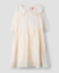 Calf-length dress in dot voile with short sleeves, detachable collar in beautiful organdie and crocheted lace. Wrinkled from the waist for lovely volume, side seam pockets and buttoning at the back with covered buttons.