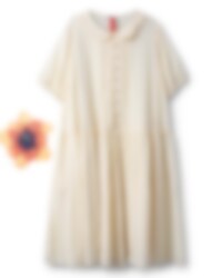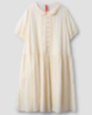 Calf-length, loose fitted dress in sushi voile, short sleeves with elastic hem. Wrinkled from the hip for lovely volume, pockets in side seams, collar with lace and buttoning at the front with covered buttons.