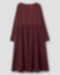 V-necked, calf-length dress in striped linen with long sleeves. Wrinkled from the waist for lovely volume, side seam pockets, wide hem in velvet and buttoning at the back.