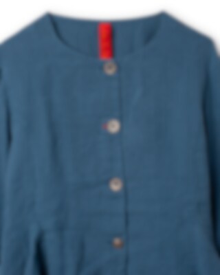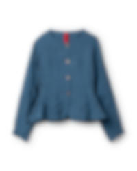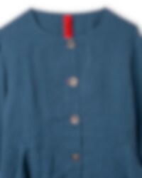 Jacket in linen in a slightly fitted model with wedges from the waist front, wrinkled flounces and tie ribbons at the back for a lovely silhouette. Buttoned front with different buttons and one buttonhole placed on a patch and sewn in red for a playful effect.